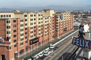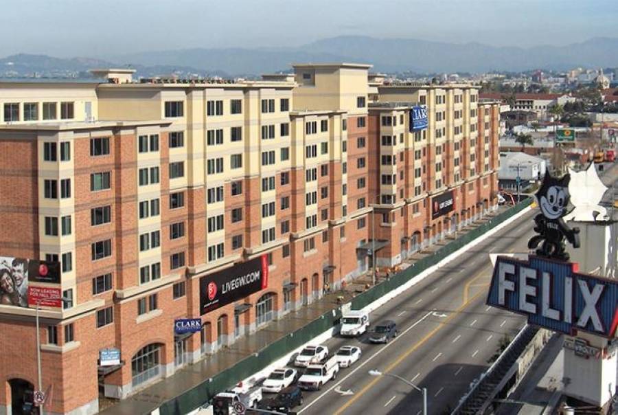 Mixed-use student housing project adjacent to the campus of the University of Southern California. 8-Story concrete structure contains a bookstore, restaurants, retail, and student facilities on the ground floor, with housing units above for 1,600 students. 408 two-bedroom, two-bathroom units; 13 one-bedroom, one-bathroom units.