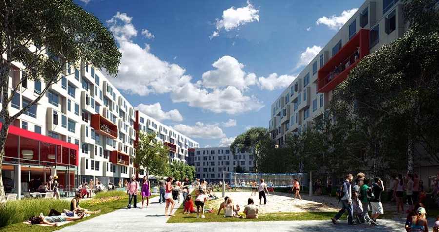 Design Build 270,000-SF Graduate and Professional Students and Mixed-Use Housing complex consists of 853 single occupancy micro apartments; 254 one-, two-, and three-bedroom apartments; and common areas resulting in a total of 1,355 beds. The project also includes a 908-space multi-floor above-ground concrete parking structure which serves students, faculty and staff residents; and 11,000 SF of common amenity and administration space. The project complies with the University of California Policy on Sustainable Practice and delivers a LEED Gold Certification.