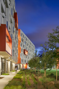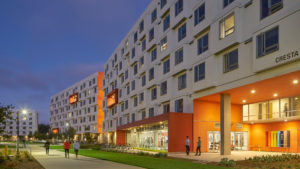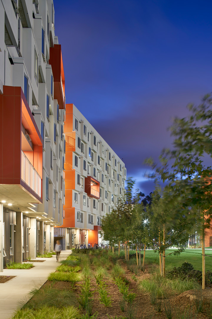 Design-build 270,000-SF Graduate and Professional Students and Mixed-Use Housing complex consists of 853 single occupancy micro apartments; 254 one-, two-, and three-bedroom apartments; and common areas resulting in a total of 1,355 beds. The project also includes a 908-space multi-floor above-ground concrete parking structure which serves students, faculty and staff residents; and 11,000 SF of common amenity and administration space. The project complies with the University of California Policy on Sustainable Practice and delivers a LEED Gold Certification/Type I Construction.