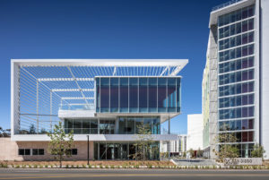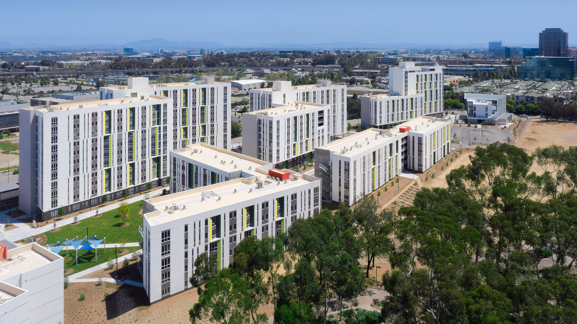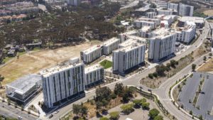 712,000 SF, Nuevo East Student Housing is a mixed-use residential and common amenity program, which includes five low- and high-rise residential buildings housing 1,374 student beds in one- to four-bedroom apartments and townhomes. Nuevo East includes a student wellness and resource center called the Exchange Building. The Nuevo East residential community is supported by a mix of shared amenities such as support spaces, laundry facilities, fitness and wellness spaces, administrative offices, multi-purpose rooms, community gathering spaces, a public plaza, and community gardens. The project includes a surface parking lot with 550 spaces, which will include ADA spaces, electric vehicle charging areas, and Clean Air Vehicle spaces.