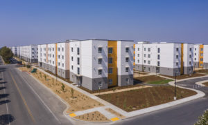 Project includes construction of approximately 3,311 beds, 1,257 units of apartment-style housing to graduate and transfer students. The community consists of nine four-story residential buildings, a community center, and a maintenance center constructed using the prefabricated Prescient structural system atop concrete slabs on grade. A net-zero community project includes an exterior insulation and finish system for continuous insulation, TPO roofing, high-efficiency split-system HVAC, electric boilers, and net metering from solar panels over the carports.