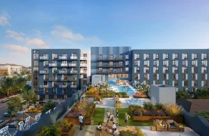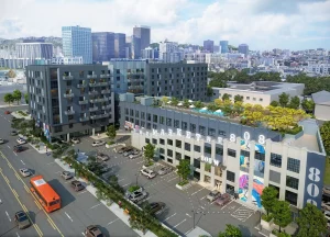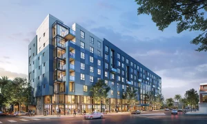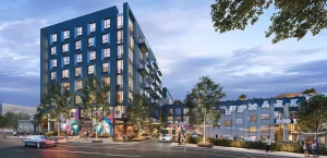 800 Western (Western Station) is an eight-story mixed-use residential development located at 800 S. Western Avenue in the heart of Koreatown, Los Angeles. The project includes 230 residential units, offering a mix of studio, one-, and two-bedroom apartments, with 23 affordable units designated under the Transit-Oriented Communities program. The development features approximately 13,300 square feet of ground-floor retail and amenity space, integrated with the restored historic Pellissier Square Garage, a 1930s Art Deco structure now repurposed for parking and rooftop amenities. Built with a podium-style structure-three levels of concrete topped by five levels of wood framing-the building stands out with its contemporary design and prominent corner balconies.