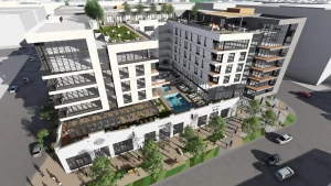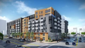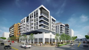 Jefferson Makers Quarter is an eight-story mixed-use residential development in San Diego’s East Village within the Makers Quarter neighborhood. The mid‑rise building delivers 368 rental units (comprising 99 studios, 200 one‑bedroom, and 69 two‑bedroom apartments, including 19 affordable units), alongside approximately 10,000-12,000 sq ft of ground‑floor commercial/retail space. The project includes three levels of below‑grade parking totaling 462 spaces, and preserves the historic Walter Casey Ford dealership façade as part of its retail frontage.