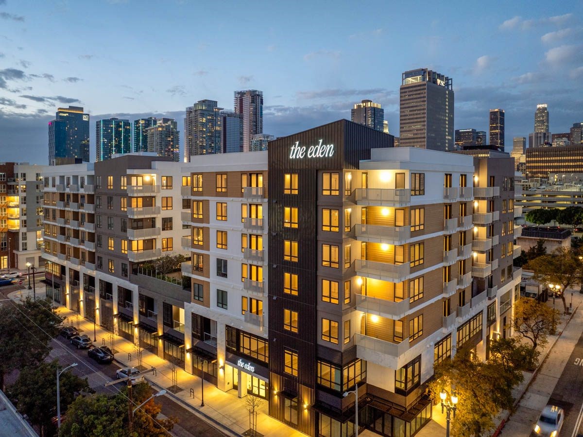 1340 S. Hill Street – “The Eden” Apartments is a seven‑story, mixed-use residential development in South Park, Downtown Los Angeles. Situated on an L-shaped parcel at the corner of 14th and Hill Streets, the building delivers 235 rental apartments above approximately 9,200 sq ft of ground-floor retail. Of the units, 12 are set aside as very low-income affordable housing and 47 for workforce housing (up to 150% of AMI), in compliance with local incentive programs. Floor plans range from 375 to 1,093 sq ft. The complex includes subterranean parking and resident amenities such as courtyards, a fitness center, a pool, and a rooftop deck. The total gross building area is roughly 219,000 sq ft, reflecting a modern podium-type design typical of the neighborhood’s recent residential infill developments.
